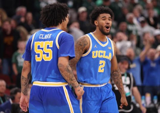 UCLA guards Donovan Dent, right, and Skyy Clark, along with their teammates, are focused on trying to make a deep NCAA tournament...