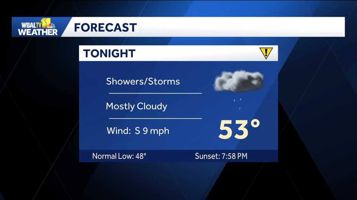 Heavy rain and thunderstorms will build in the Baltimore area later on Wednesday. There’s also an isolated risk for severe weather, but the chance is decreasing due to the cloud cover.
