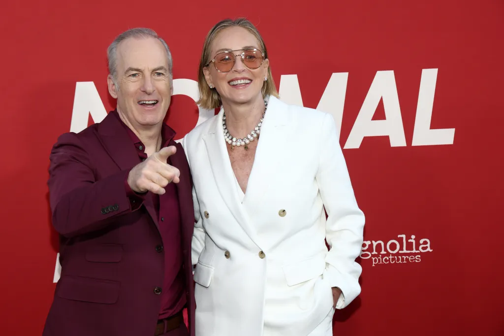 Bob Odenkirk and Sharon Stone attend the premiere of “Normal” at Hollywood American Legion on April 15, 2026, in Los Angeles, Calif.